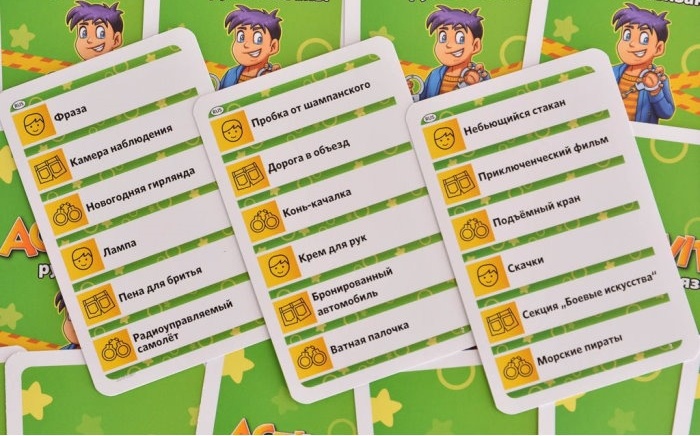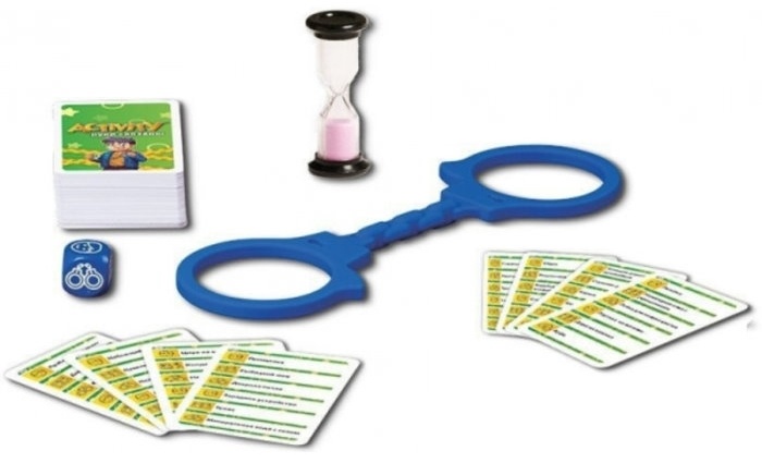 In set55 de cărți cu cuvinte, o pereche de cătușe din plastic moale, cub, clepsidră, regulile jocului
