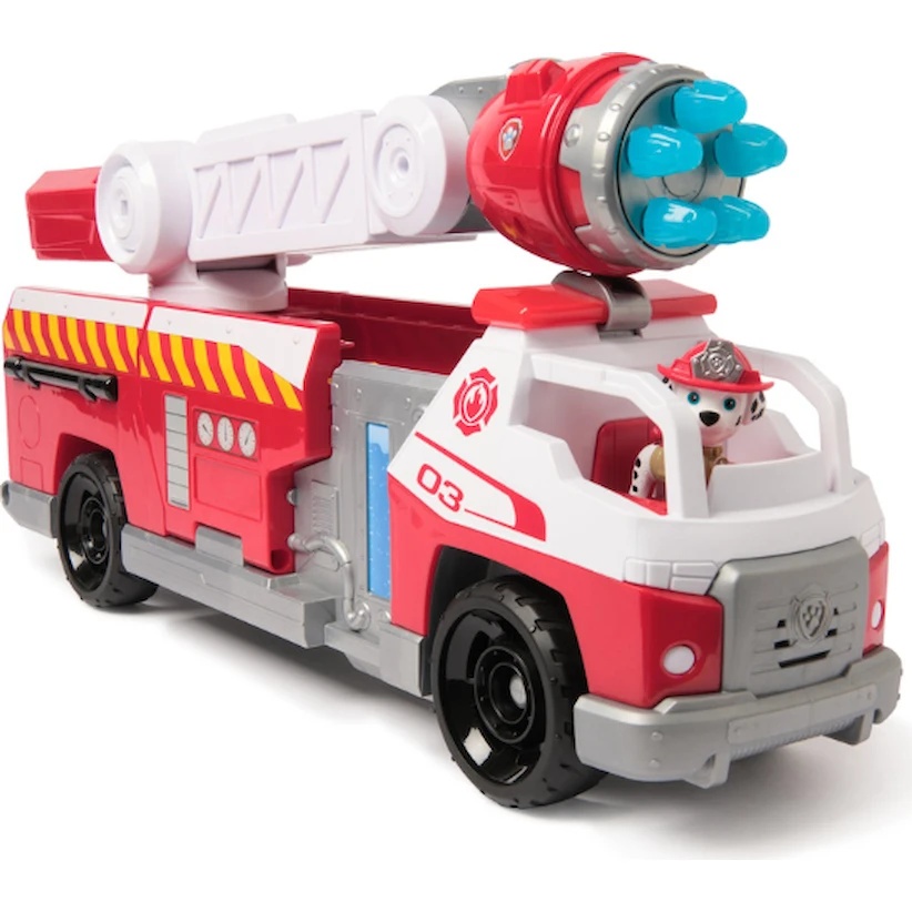 Pregătește-te pentru misiuni palpitante alături de mașina de pompieri a lui Marshall din seria Patrula Cățelușilor! Jucăria are efecte luminoase și sonore, scară mobilă și mecanism pentru lansarea proiectilelor cu apă.