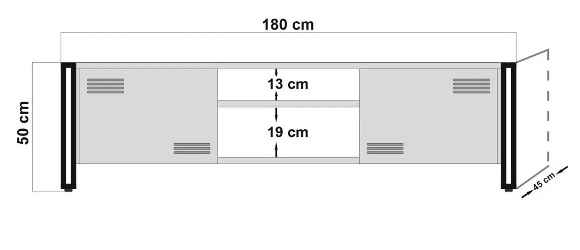 Cu uși și mânere placate cu metal, suportul TV emană un stil modern cu accente industriale. Lățimea de 180 cm, înălțimea de 50 cm și adâncimea de 45 cm oferă suficient spațiu pentru televizor și accesoriile dvs. Numeroasele rafturi și înălțimea de 16 cm a compartimentelor permit organizarea perfectă a dispozitivelor media, a consolelor și a elementelor decorative.