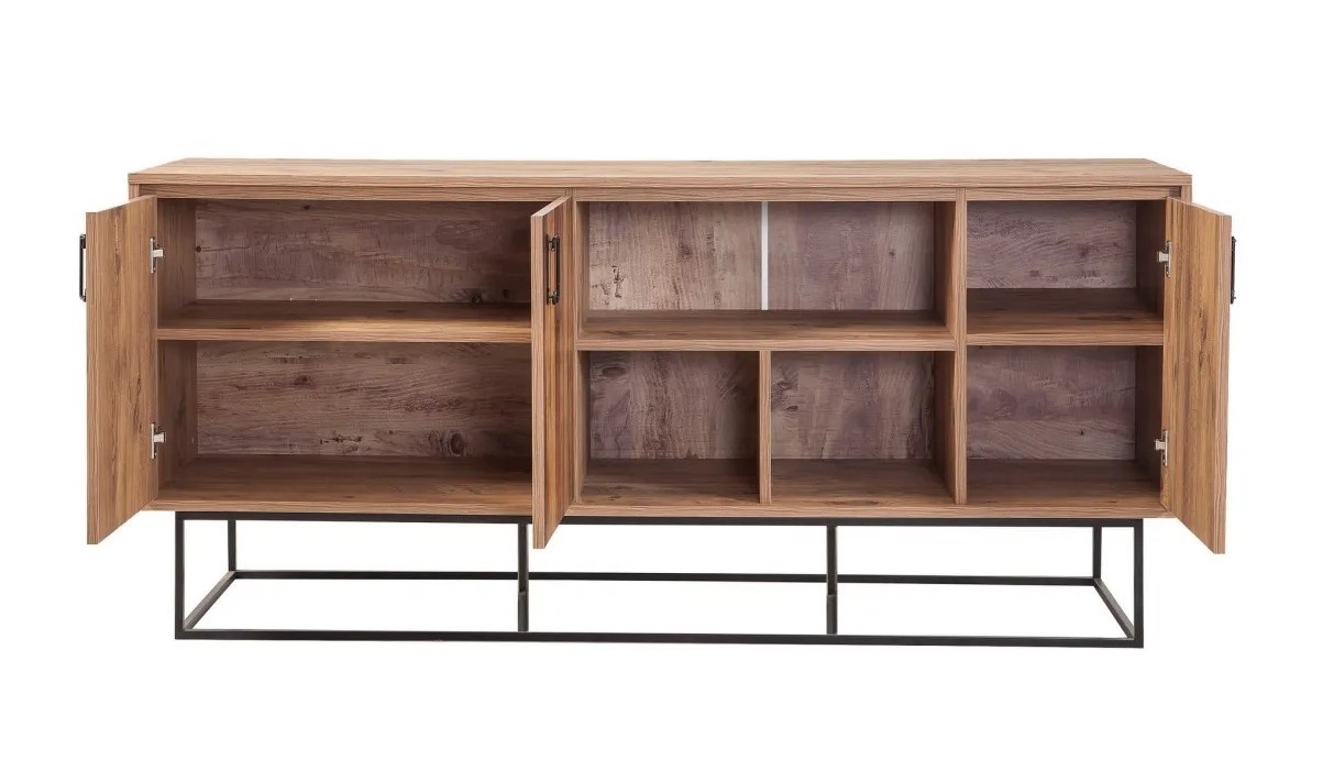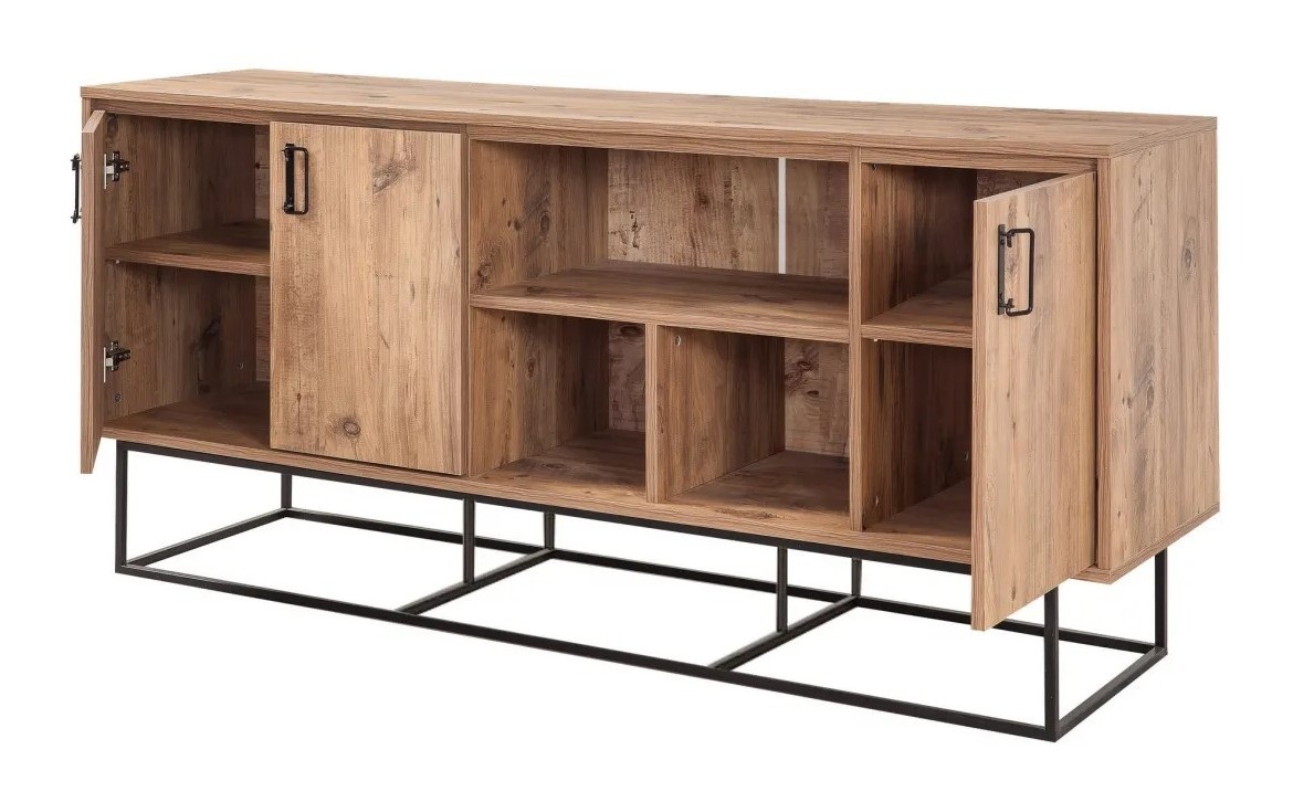 Cu designul său industrial modern și inedit, această consolă se potrivește fără efort cu orice stil de interior, de la contemporan la rustic. Liniile sale curate și mânerele metalice adaugă o notă de eleganță, în timp ce cadrul metalic asigură stabilitate și durabilitate.