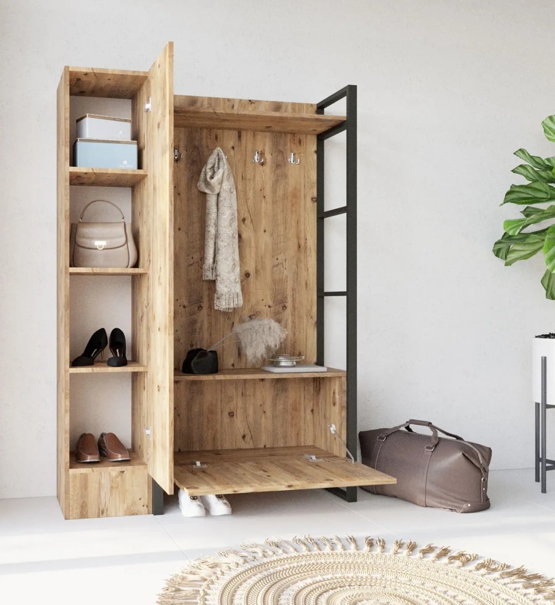 Impresionează-ți oaspeții cu un suport de hol modern și funcțional, conceput pentru a îmbunătăți instant aspectul intrării. Designul contemporan și structura sa originală adaugă un plus de rafinament, iar cadrul metalic în stil industrial creează un accent estetic plăcut.