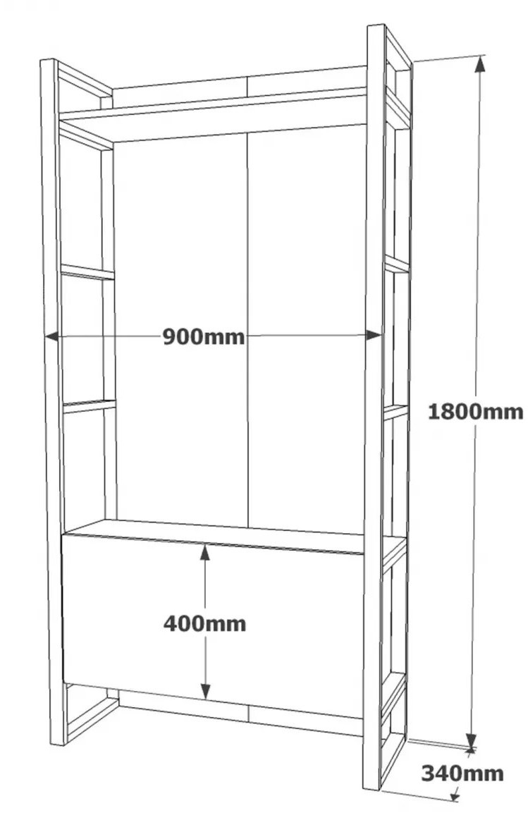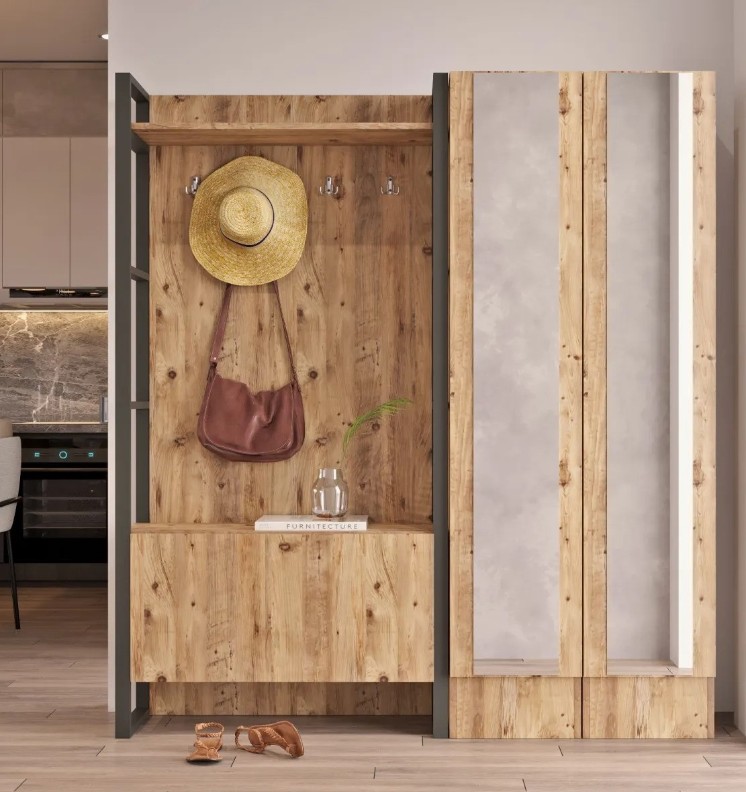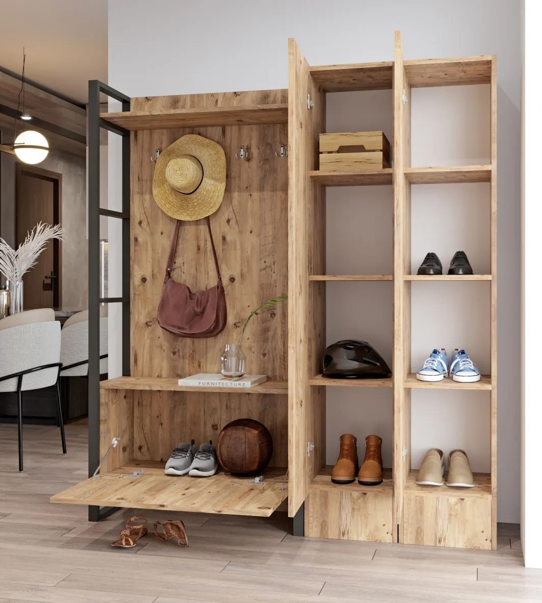 Construcția din plăci acoperite 100% cu melamină asigură durabilitate, iar cadrul metalic solid oferă stabilitate pentru agățarea hainelor și accesoriilor. Rafturile spațioase pun la dispoziție suficient loc pentru încălțăminte, genți și alte obiecte esențiale, menținând intrarea ordonată și bine structurată.