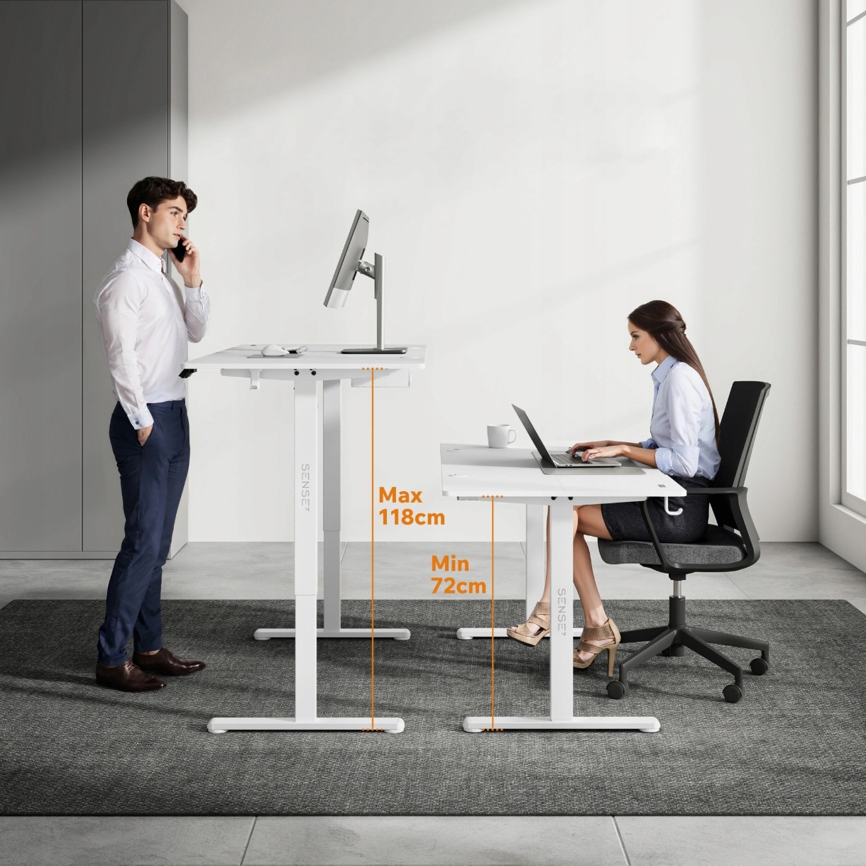 Mecanismul de reglare a înălțimii funcționează silențios în intervalul 72–118 cm.
