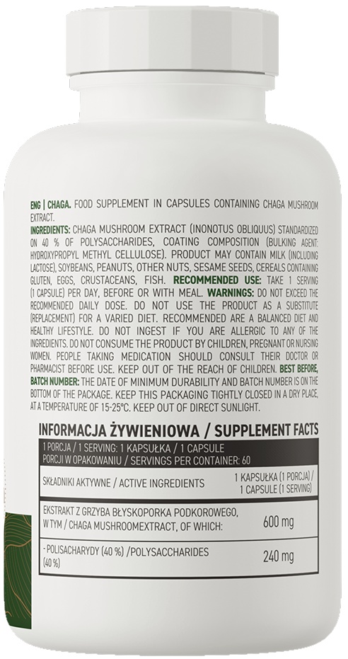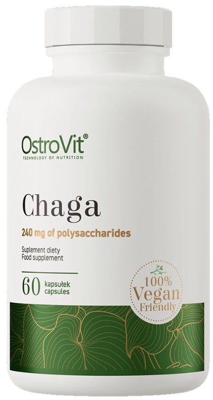 OstroVit Chaga VEGE este un supliment alimentar de înaltă calitate care conține extract de chaga standardizat la 40% polizaharide DER 20:1. Acesta este un produs vegan, disponibil în capsule ușor de înghițit, conceput pentru persoanele care doresc să-și suplimenteze dieta cu ingrediente naturale, valoroase.