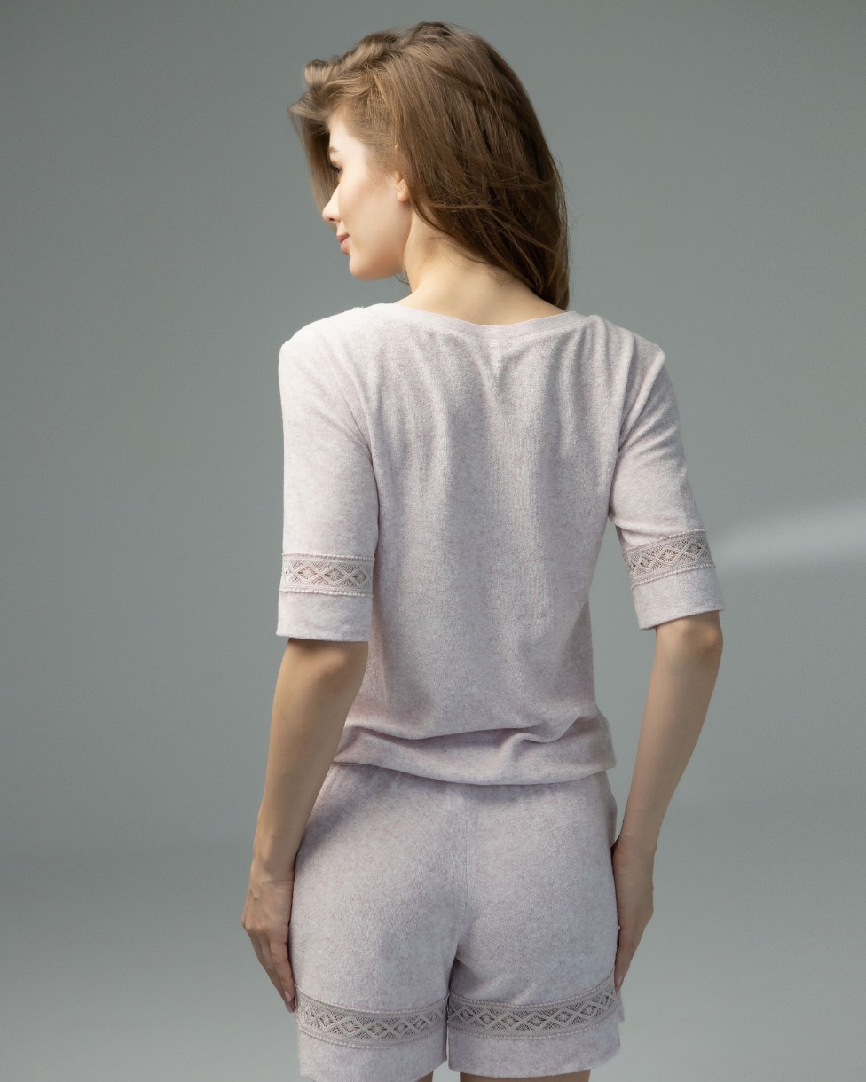 Bluza cu decolteu rotund și bordură reiată la răscroiala gâtului și la tiv, mânecă scurtă cu inserții de dantelă.