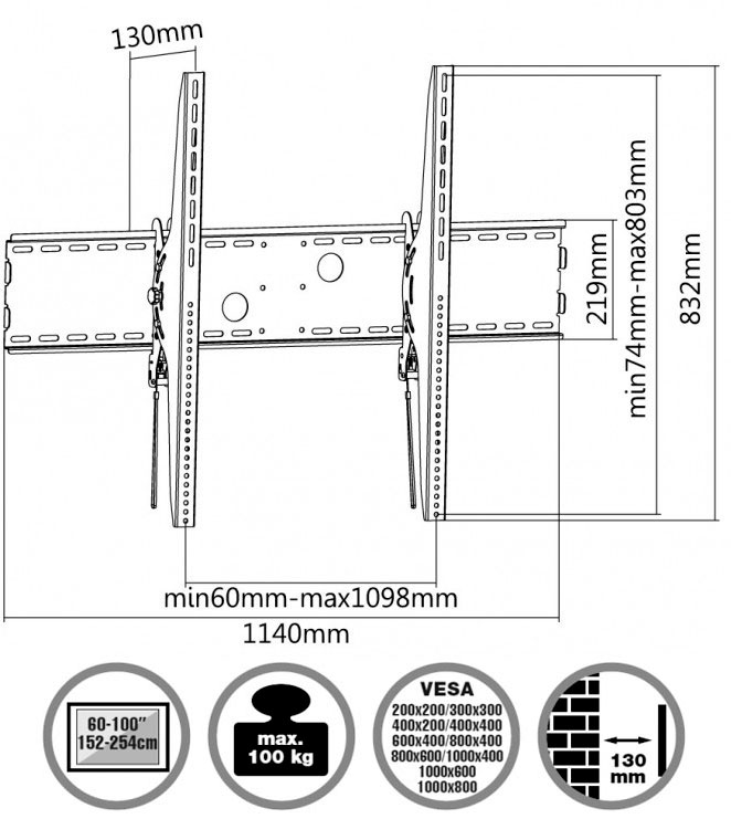Standard VESA200x200, 300x300, 400x200, 400x400, 600x400, 800x400, 800x600, 1000x400, 1000x600, 1000x800 mm