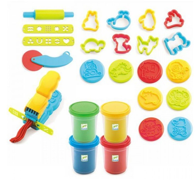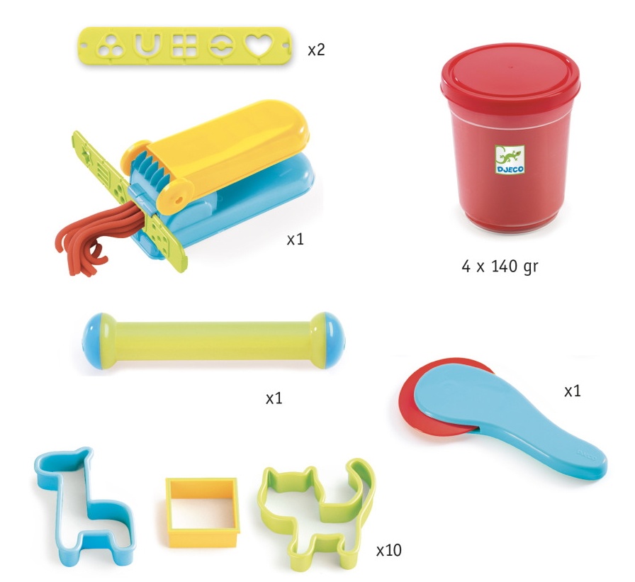 Echipamente4 borcane de plastilină, vergea, cuţit, 8 matrite, 8 timbre, presa