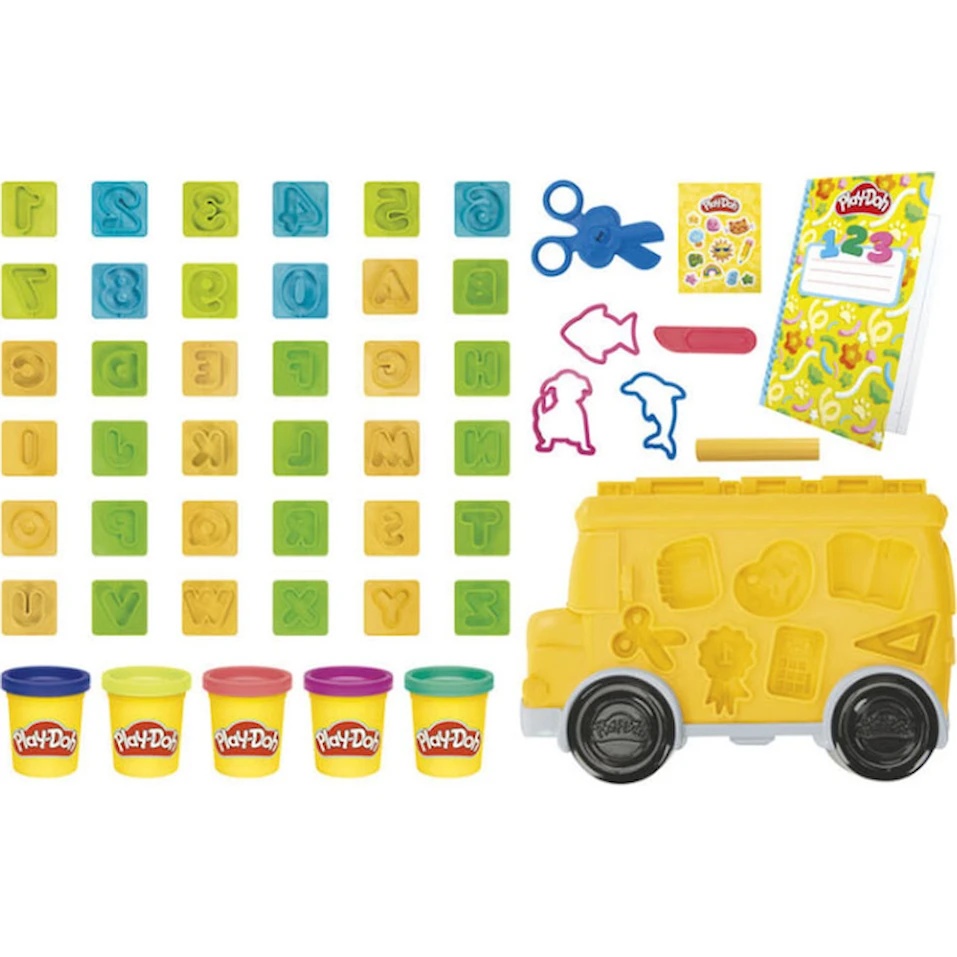 Jucăria sub formă de autobuz școlar se deschide, dezvăluind numeroase forme amuzante pe care copiii le pot modela atât în interior, cât și în exterior. Folosiți ștampilele pentru a crea întregul alfabet și cifrele de la 0 la 9, precum și pentru a face câini, delfini și pești cu ajutorul matrițelor pentru animale.
