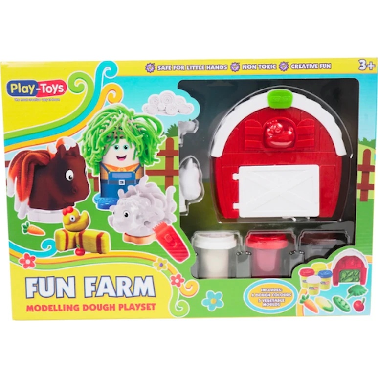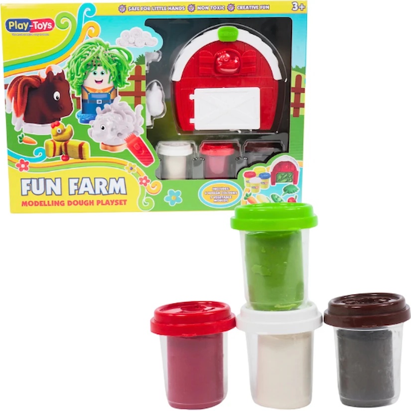 Transformați joaca într-o aventură fermecătoare pe fermă cu Setul de modelaj Play Toys „Ferma Veselă”! Setul include 4 borcănele de plastilină sigură de 50 g fiecare (verde, maro, roșu și alb) și 7 forme tematice pentru a crea animale, hambare și alte figurine.