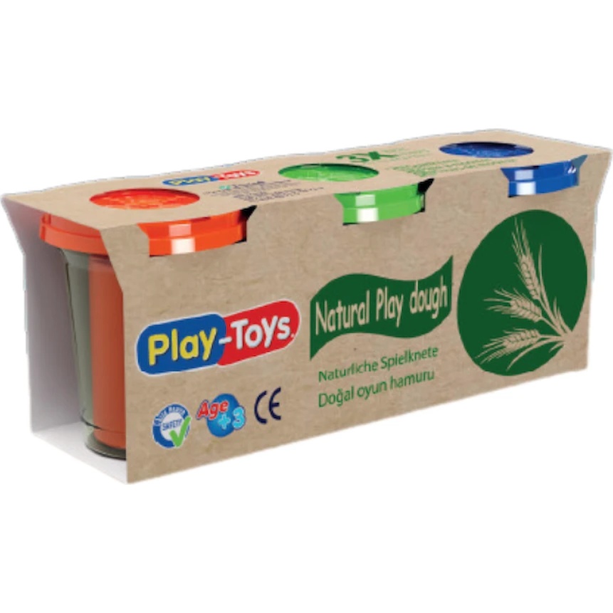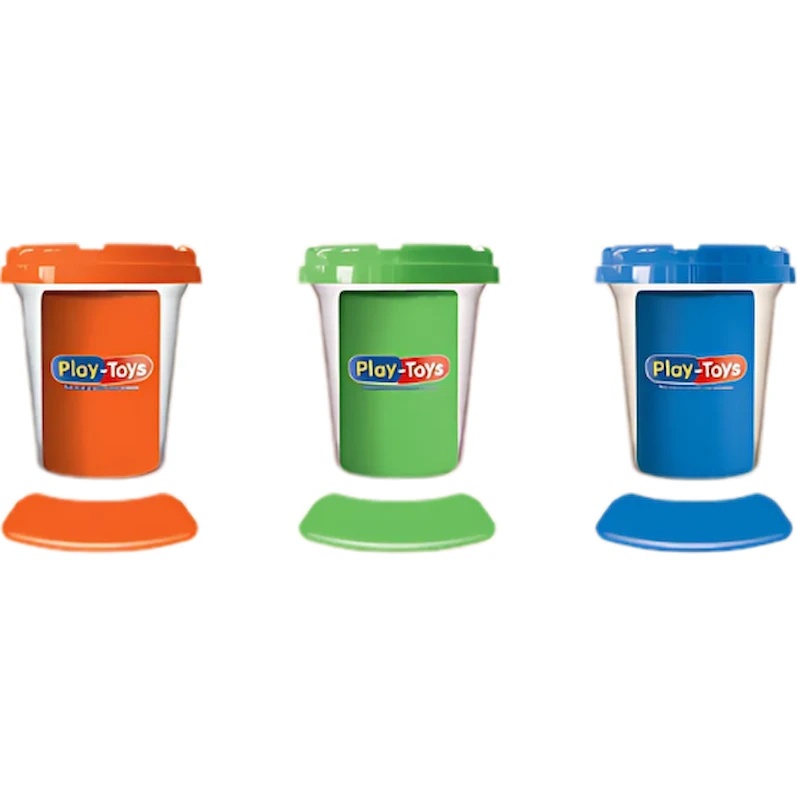 - 3 borcănele de plastilină de 30 g fiecare, în culorile roșu, galben și albastru