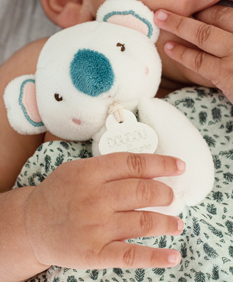Micuța mea jucărie de pluș Koala este pur și simplu adorabilă, cu fața sa dulce, armoniile sale subtile și moderne de culori, amestecul său de materiale foarte moi și atingerile sale de muselină cu motive botanice. Are un număr unic, garantând jucăria sa de pluș.