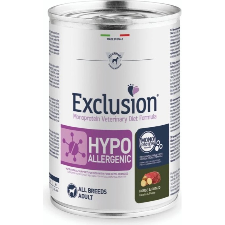 Exclusion Monoprotein Veterinary Diet Formula Hypoallergenic este un aliment veterinar complet care conține surse selectate de proteine și carbohidrați, dezvoltat pentru câinii adulți pentru a reduce intoleranța la ingrediente și nutrienți.