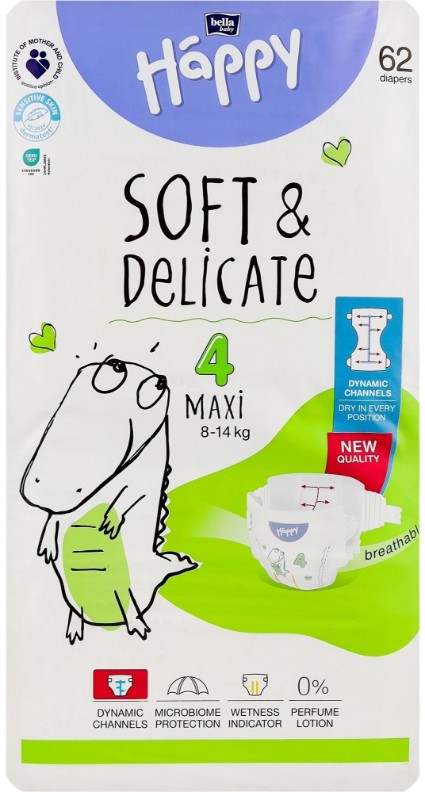 Scutece Bella Baby Happy 4 Maxi (8–14 kg), 62 buc. — sunt scutece confortabile și fiabile pentru copiii activi, care descoperă lumea în fiecare zi. Sunt concepute ținând cont de pielea sensibilă a bebelușilor și oferă uscăciune și confort pe tot parcursul zilei.