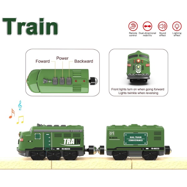 Setul de tren este o completare excelentă pentru orice cale ferată. Roțile și șasiul sunt proiectate de experți pentru o deplasare lină și sigură pe șinele de lemn populare. Compatibil cu seturile „Thomas și prietenii săi”, Brio, Chuggington, Melissa and Doug, Kidkraft și altele.