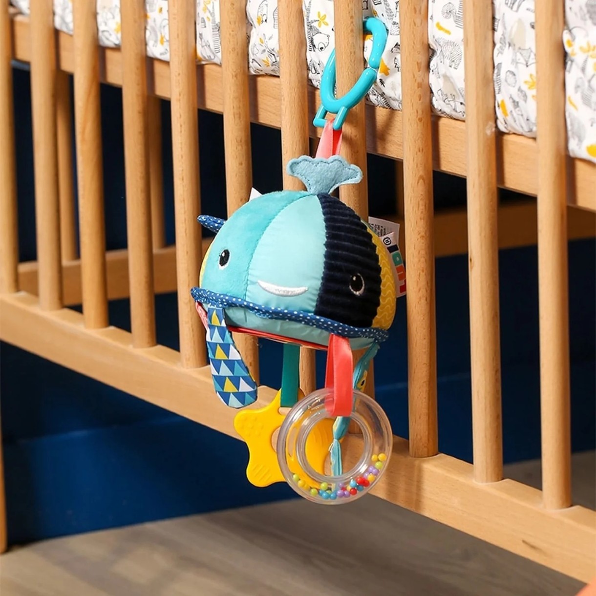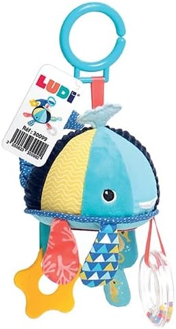 Aceasta jucarie textila in forma de balena este perfecta pentru a fi agatata la carucior, patut sau in masina, oferind bebelusului distractie si stimulare senzoriala in orice moment al zilei. Confectionata din materiale moi si colorate, jucaria include diverse elemente tactile si sonore: oglinda, bilute zornaitoare, materiale fosnitoare si inele pentru dentitie.
