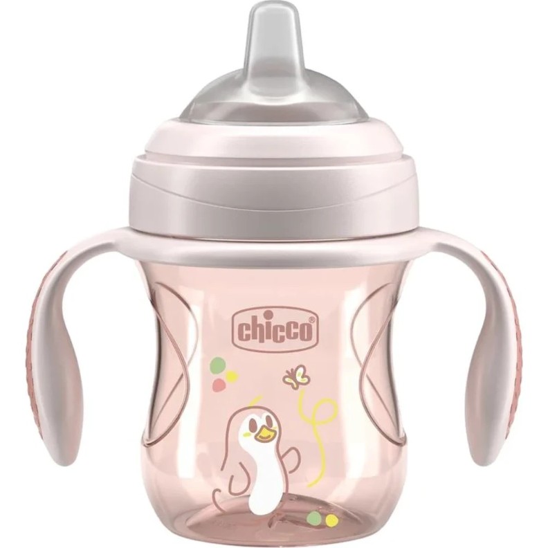 Biberonul Chicco cu cioc moale ajută micuții să treacă mai ușor de la hrănirea cu biberonul la băutul din prima cană. Ciocul moale din silicon are o formă confortabilă pentru poziția naturală a capului în timpul băutului, asigurând confort și prevenind senzațiile neplăcute. Mânerele ergonomice detașabile cu suprafață antiderapantă oferă ușurință în utilizare, iar construcția etanșă împiedică vărsarea lichidului, permițând copilului să controleze singur fluxul. Setul include un capac de protecție pentru depozitarea igienică. Biberonul poate fi spălat în mașina de spălat vase și nu conține bisfenol-A, garantând siguranța copilului.