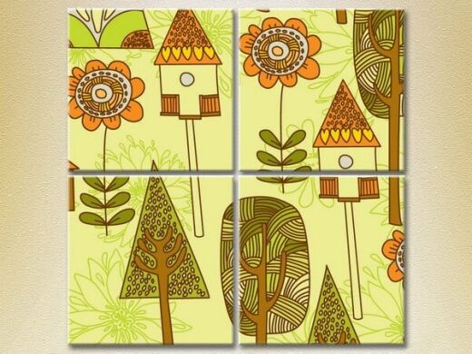 Pictură Rainbow Polyptych Trees and birdhouses (2230544)