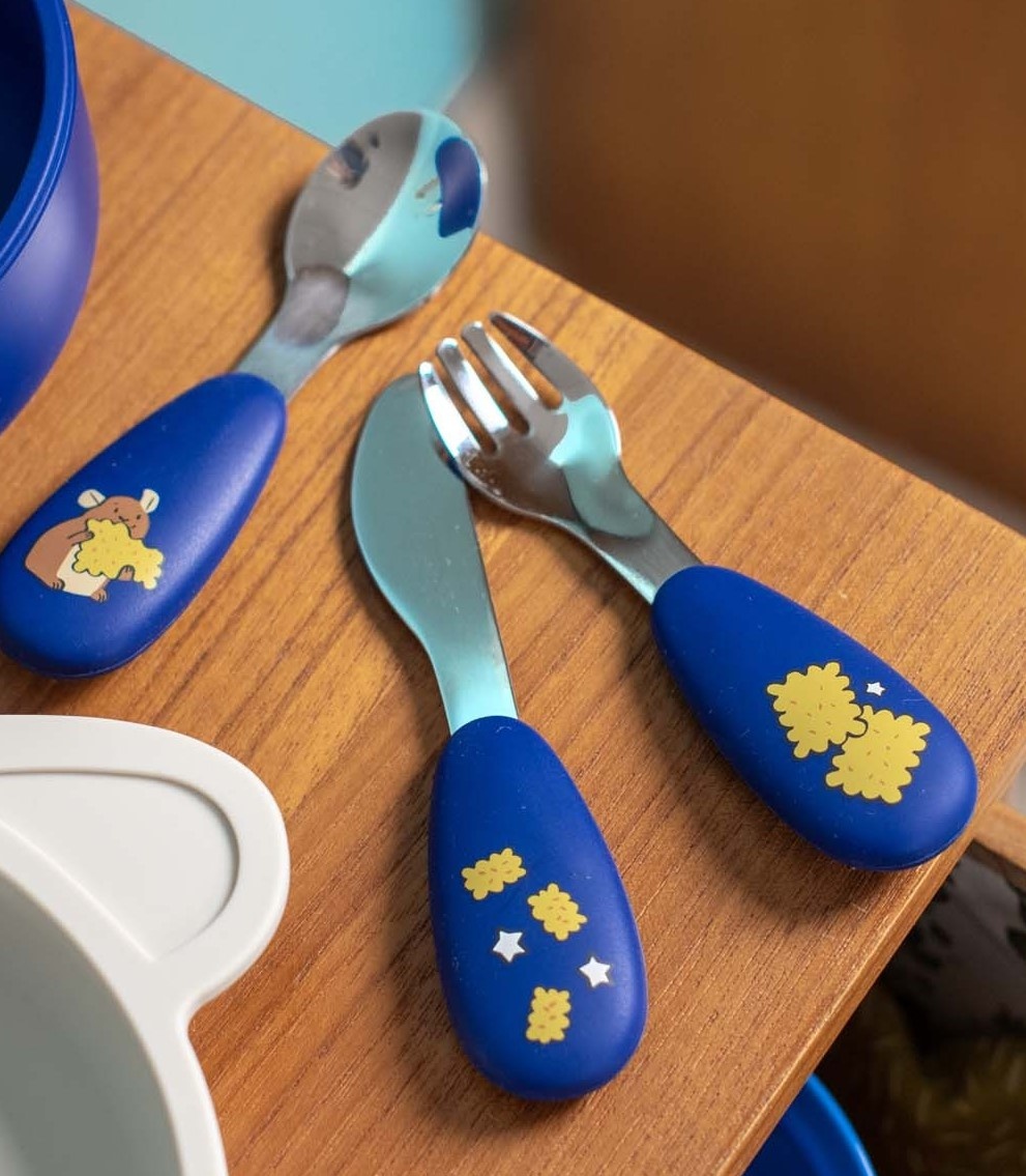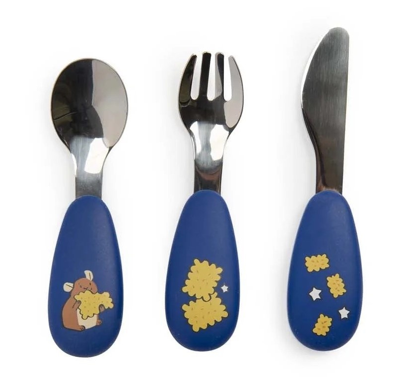 Set de 3 tacâmuri din oțel inoxidabil și silicon pentru o prindere bună, pentru a mânca precum un om mare. Se pot spăla în mașina de spălat vase. Cu ilustrații drăguțe, Après la pluie.
