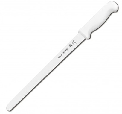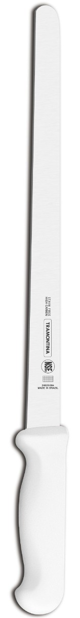 Cuțitul Tramontina Professional pentru feliat are lama de 35.5 cm. Lama forjată este realizată din oțel inoxidabil carbon cu adăugare de crom și molibden DIN 1.4110, 2 mm grosime. Lama nu își pierde luciul, rezistentă la coroziune și la temperaturi ridicate. Își păstrează marginea foarte ascuțită pentru mult timp. Lama în formă de V, garantează o tăiere perfectă și precisă, chiar și după utilizarea prelungită. Mâner anatomic - masiv, confortabil, cu o prindere puternică comodă - din polipropilenă. Acoperirea antibacteriană specială Microban cu efect antiderapant protejează împotriva mirosurilor, murdăriei și mucegaiului, previne creșterea ciupercilor și microbilor.