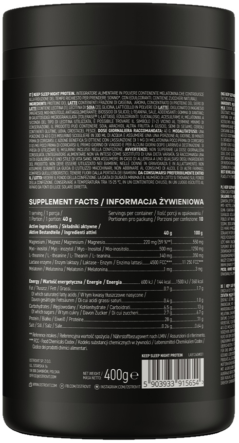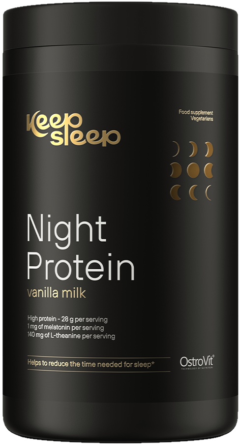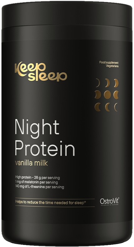 OstroVit Keep Sleep Night Protein este un supliment alimentar de înaltă calitate, care reprezintă o sursă de proteine și substanțe valoroase precum melatonină, mio-inozitol, L-teanină, magneziu și enzima lactază. Un produs cu gust plăcut, disponibil într-o formă practică de pulbere. Acest supliment concentrat este creat pentru persoanele care pun accent pe refacerea corectă a energiei și pe un somn de calitate.