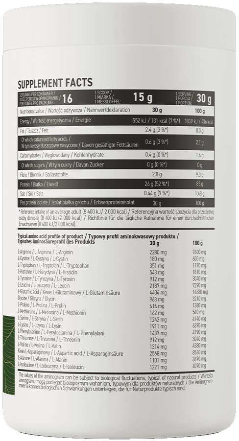 Izolatul proteic din mazăre folosit în OstroVit are o compoziție bogată de aminoacizi, ceea ce are un efect pozitiv asupra calității suplimentului alimentar și îl face un produs complet care poate fi folosit și de persoanele care urmează o dietă pe bază de plante.