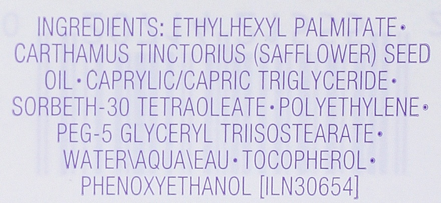 Ethylhexyl Palmitate, Carthamus Tinctorius (Safflower) Seed Oil, Caprylic/Capric Triglyceride, Sorbeth, 30 Tetraoleate, Polyethylene, PEG-5, Glyceryl Trisostearate, Water/Aqua/Eau, Tocopherol, Phenoxyethanol.
