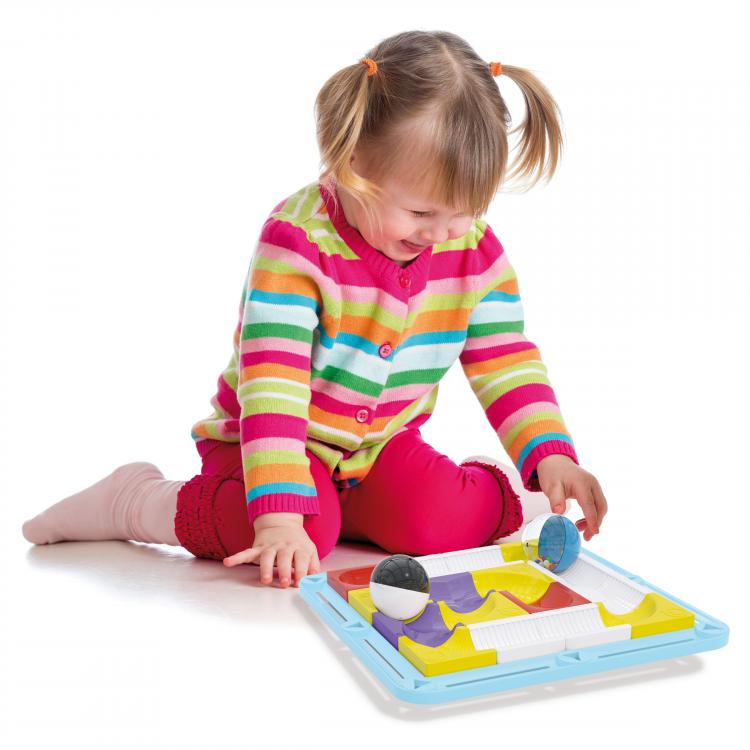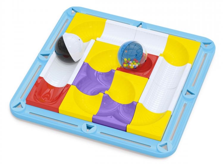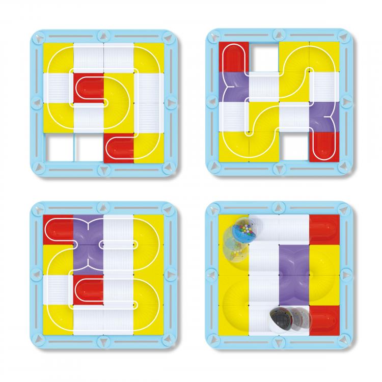 Plasați cele 16 elemente modulare în cadru, apoi faceți bilele să urmeze piesa în direcția corectă și la viteza potrivită. Este distractiv și surprinzător pentru copii să-și folosească degetele pentru a înclina pista și a vedea bilele.