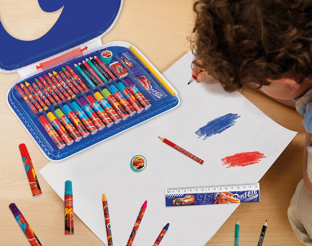 In set12 creioane, 12 markere, 6 creioane colorate, 1 riglă, 1 creion, 1 radieră, 1 ascuțitoare