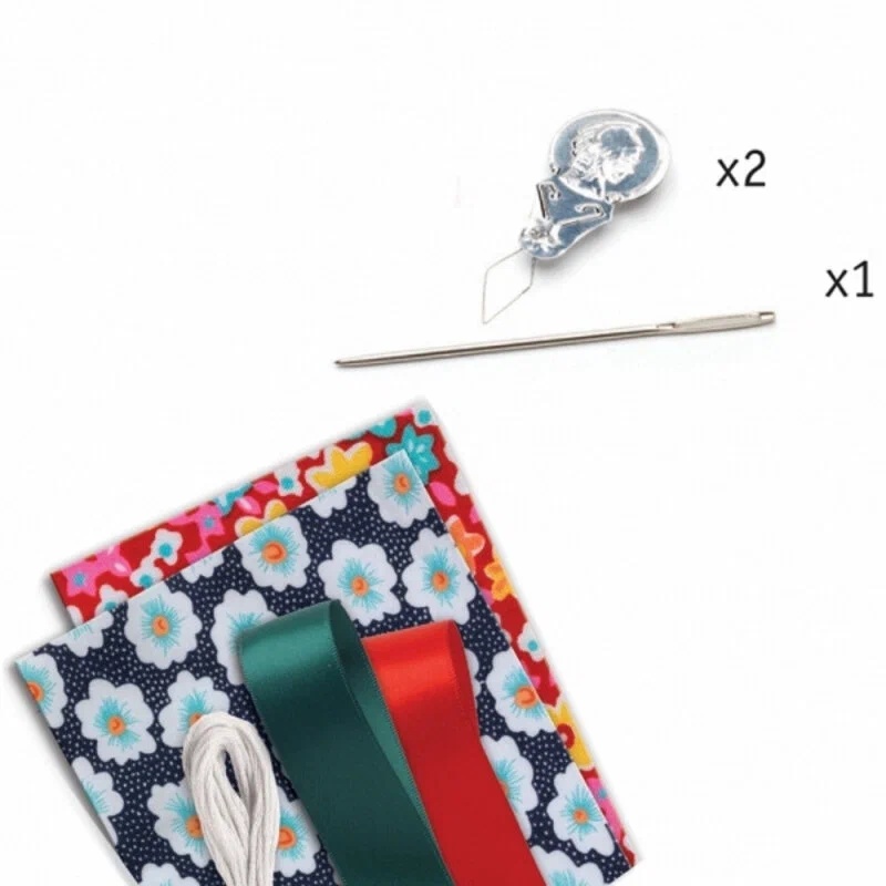 In setfire, panglici, tăieturi de țesături, 3 șabloane, 1 ac, 2 dispozitive de înfilare a firului, instrucțiuni cu vârfuri