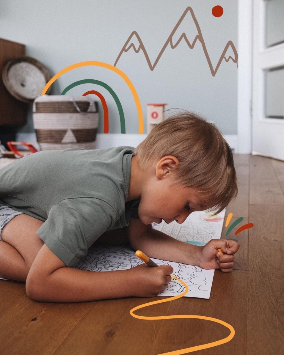 Setul include: un tub, care poate fi folosit pentru păstrarea lucrărilor artistice ale copilului;; un poster 1 metru × 0.7 metri; un set de carioci care sunt sigure pentru copii și se spală ușor de pe aproape orice material textil (Made in Germany);; un set de lipici special, care nu lasă urme pe pereți și se dezlipește ușor.