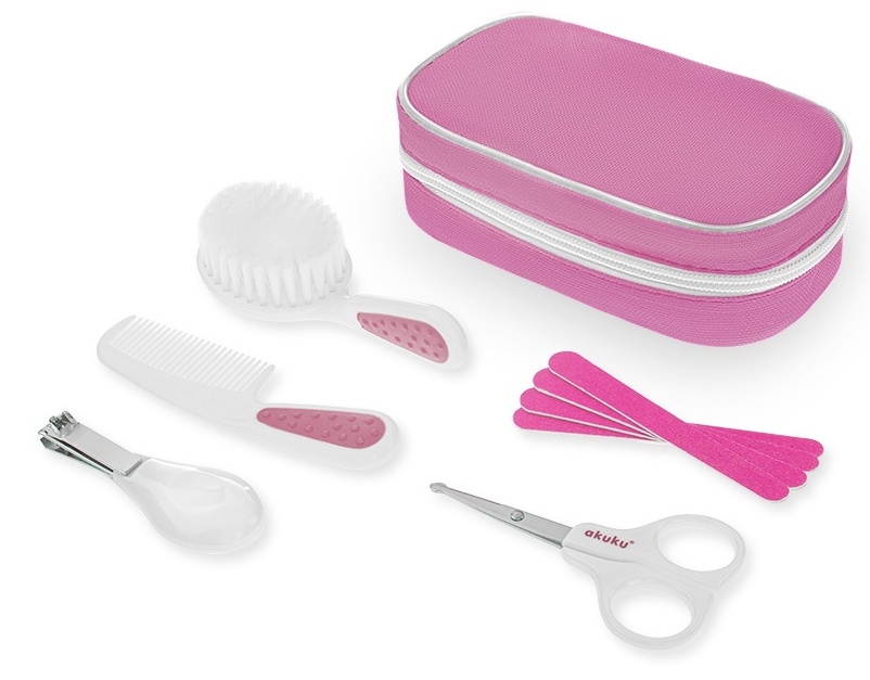 Setul de manichiura pentru ingrijirea copilului tau intr-o geanta de cosmetice confortabila si practica. Foarfecele (cu lame subțiri de metal și margini rotunjite) și mașinile de tuns vă vor ajuta să tăiați în siguranță și fiabil unghiile mici, iar pila de unghii va îndepărta cu ușurință denivelările unghiilor protejând copilul de zgâriere. Peria moale și pieptene cu mâner antiderapant vă vor permite să aveți grijă de capul bebelușului. Pentru a minimiza riscul ca bebelușul să se miște pe neașteptate, se recomandă tăierea unghiilor în timpul somnului.