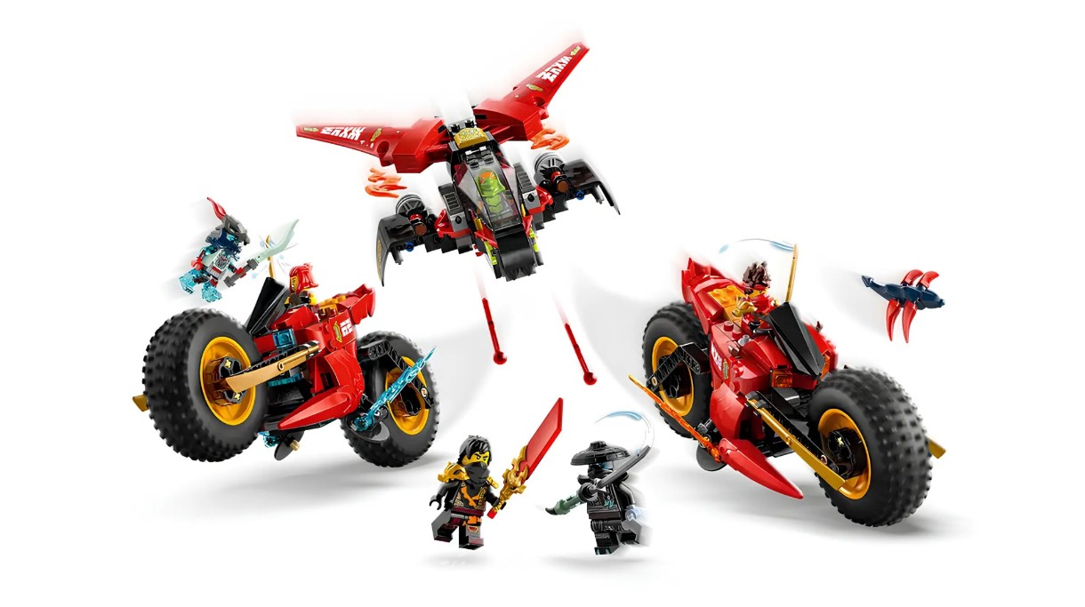 Copiii cu vârsta de 8 ani și peste pot juca scene din sezonul 3 al serialului TV NINJAGO Rise of the Dragons cu Mașina de Război Ninja 3-în-1 (71844). Copiii se pot juca cu marea Mașină de Război Ninja, apoi o pot separa în 3 vehicule mai mici: motocicleta lui Kai, motocicleta lui Wildfire și avionul lui Frack cu 2 lansatoare de piroane.