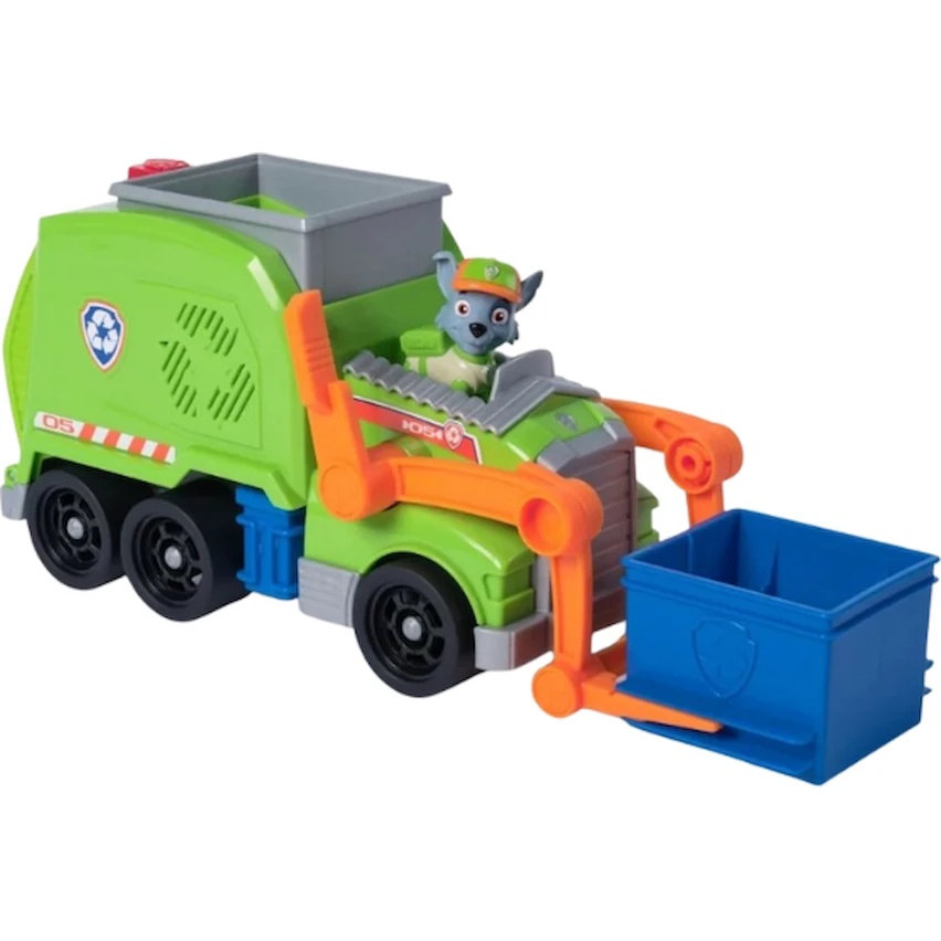 Salvează ziua împreună cu Rocky și camionul său de reciclare Crush N’ Roll! Pune-l pe Rocky la volan, încarcă mașinuța mototolită în container, glisează-l pe stivuitor și trage de manetă pentru a o introduce în reciclare. Apoi apasă butonul de pe camion pentru a coborî rampa și a transforma deșeul într-un mini vehicul cu care Rocky poate porni la drum!