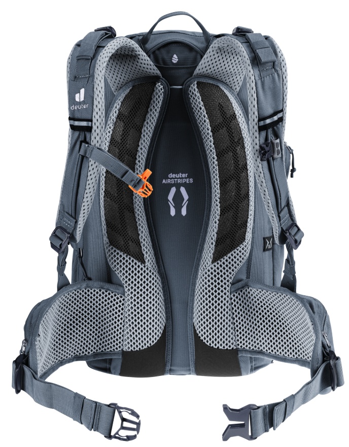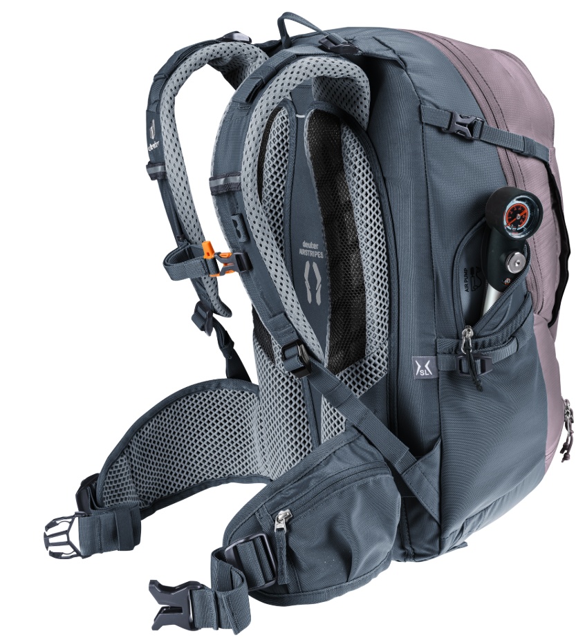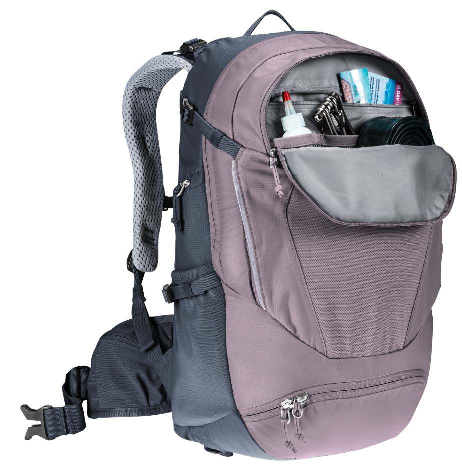 Acest rucsac spațios este ideal pentru ture alpine dificile de mai multe zile cu bicicleta de munte. Organizarea inteligentă include compartimente pentru unelte și pompă, un buzunar frontal practic care poate fi folosit și pentru depozitarea căștii, precum și un compartiment principal divizat — toate acestea oferă o utilizare facilă și o structurare bine gândită. Spatele deuter Airstripes asigură o ventilație eficientă datorită circulației aerului pe spate, oferind totodată o potrivire fixă și stabilă — aspect esențial atunci când parcurgi secțiuni tehnice ale traseului fără ca încărcătura să se deplaseze.