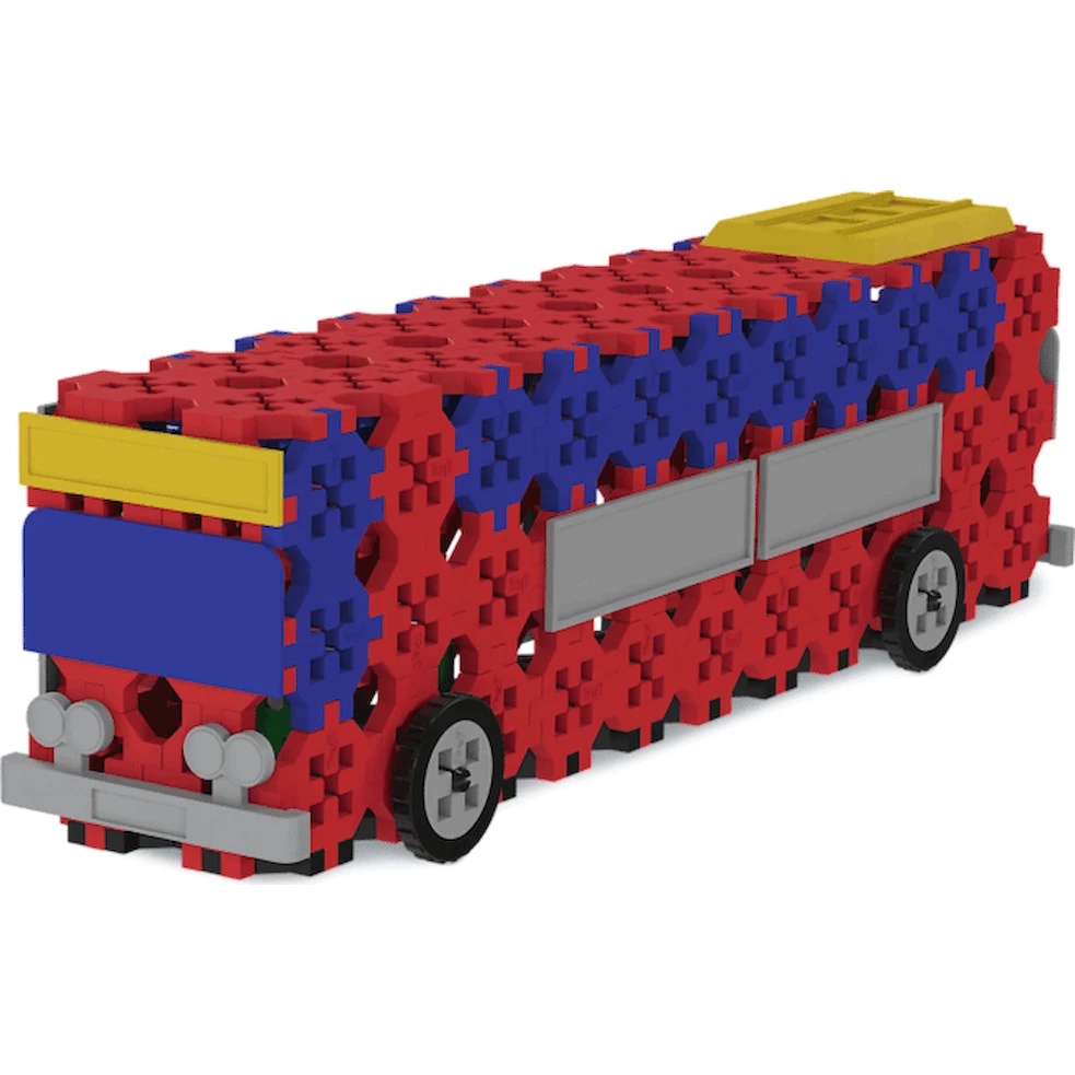 Set de construcție 2 în 1: autobuz / pick-up permite realizarea a două modele diferite: autobuz sau mașină cu remorcă. Setul conține 160 de piese, inclusiv o figurină numită Tom, elemente mobile și accesorii decorative. Modelele pot fi construite conform instrucțiunilor sau copilul își poate folosi imaginația pentru a crea propriile construcții.