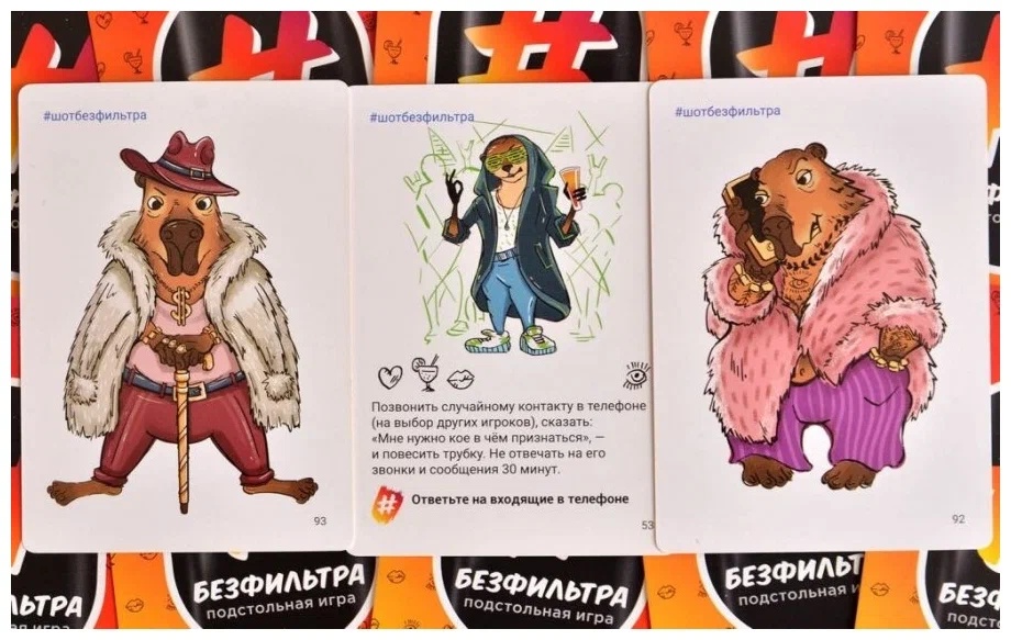 In set89 cărți de misiune, 8 cărți cu animale, o carte „Băut”, reguli de joc