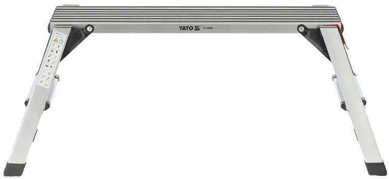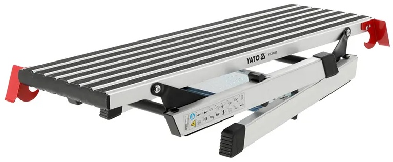 Platforma de lucru Yato GRG este destinată lucrului în siguranță la mică înălțime. Realizată din aluminiu ușor, oferă manevrabilitate bună. Platforma suportă o sarcină de până la 150 kg și are o construcție stabilă cu suprafață antiderapantă. Dimensiunile sale sunt 960 × 305 mm, iar înălțimea este de circa 490 mm, fiind potrivită pentru ateliere, șantiere și uz casnic.