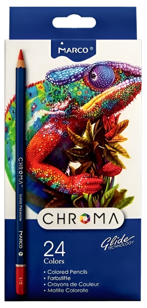 Creioanele colorate Marco Chroma în 24 culori sunt o nouă linie de creioane profesionale Marco. Corpul Chroma este fabricat din lemn de plop, iar diametrul minei este de 3,3 mm.