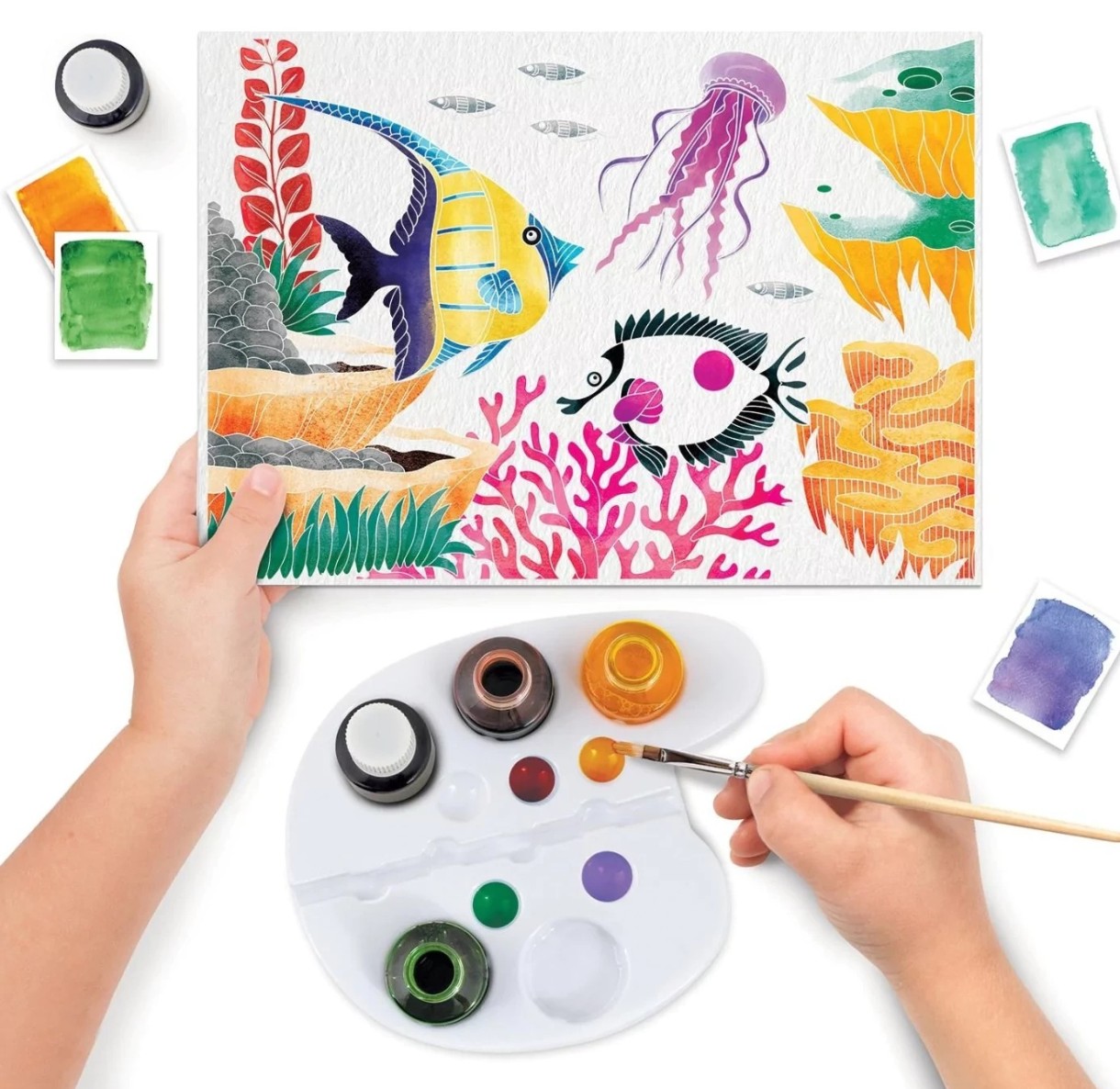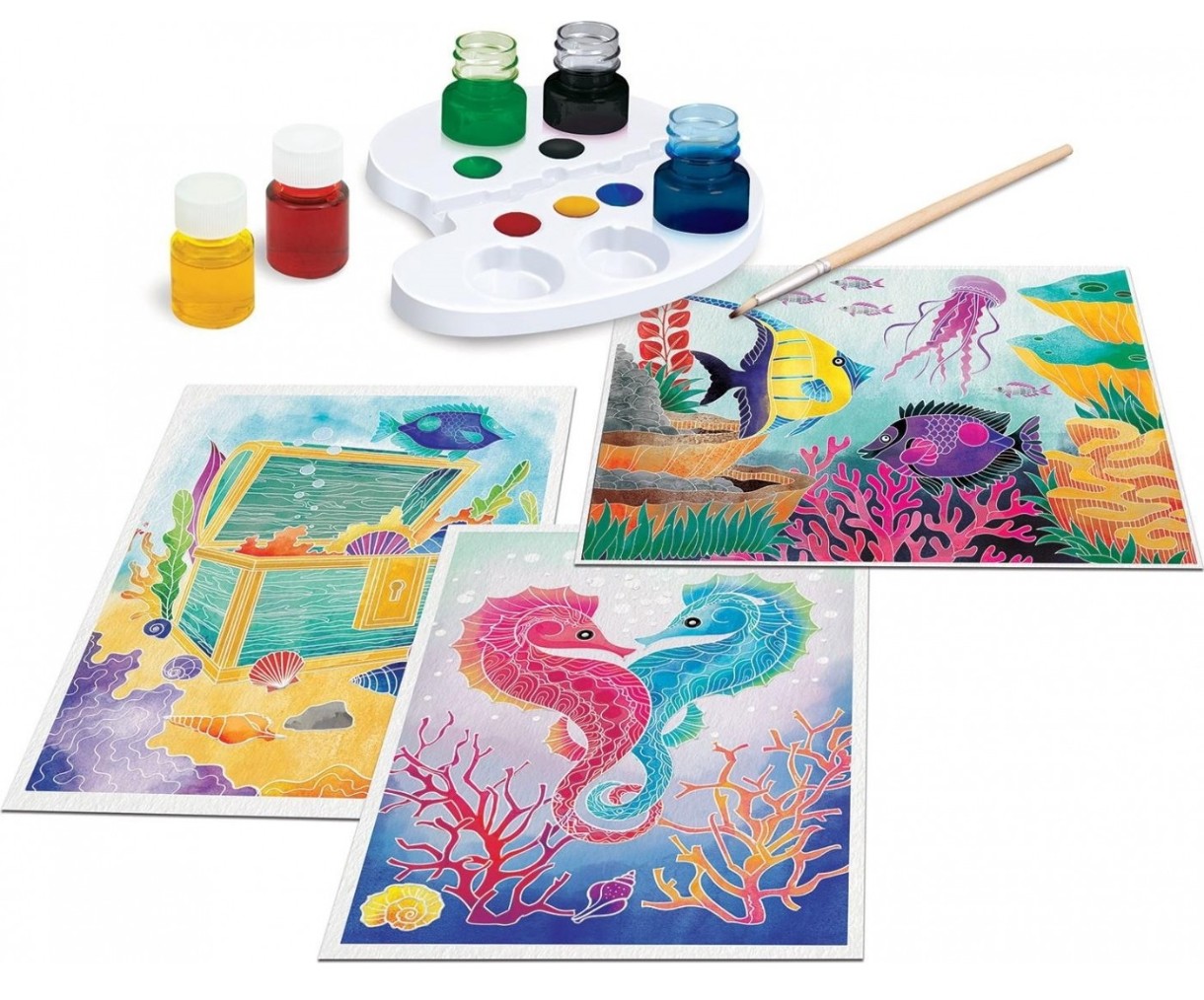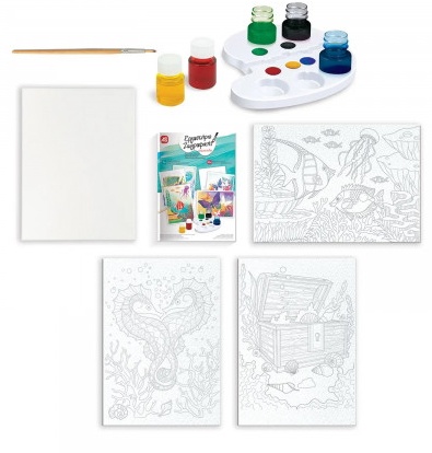 Cu Atelierul de Pictura Aquarelle Mini, te poti simti un adevarat artist! Cu acest set poti patrunde in lumea artei, de a petrece placut si productiv timpul liber. Setul este perfect pentru oricine, indiferent de varsta, nivel de experienta sau calificare. Acesta poate fi utilizat atat acasa, cat si la scoala. Uneltele si vopselele din set, va vor insoti in minunata lume a culorilor, iar creatiile finale pe panzele din set vor constitui un cadou minunat pentru cei dragi sau un element de decor unic! Tematica setului Fundul marii.