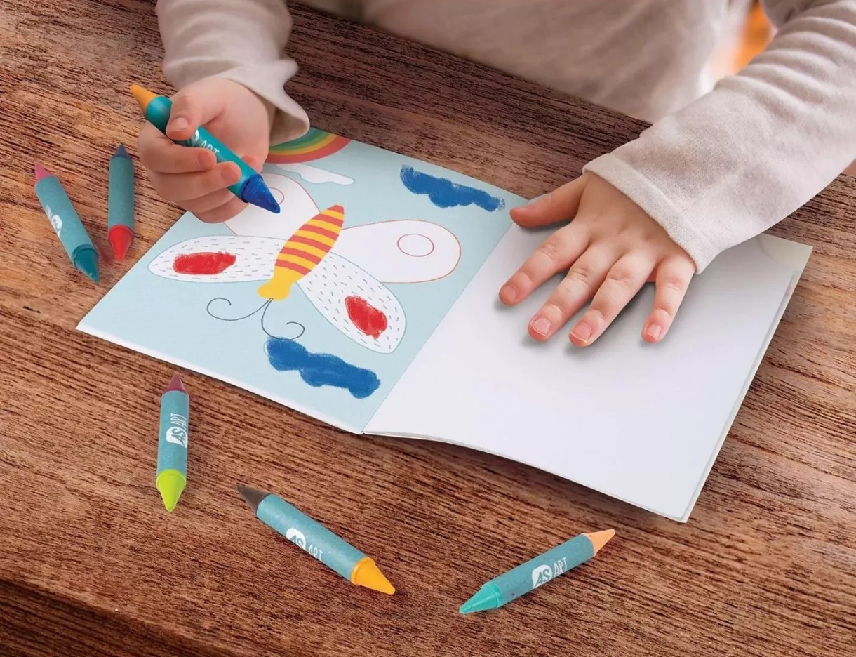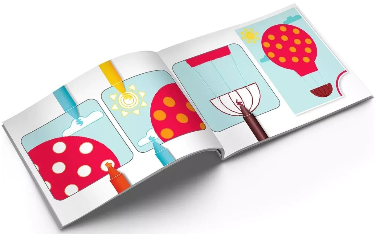 In setcaiet, 8 creioane cu două fețe (16 culori), 2 foi de autocolante, ghid detaliat pas cu pas