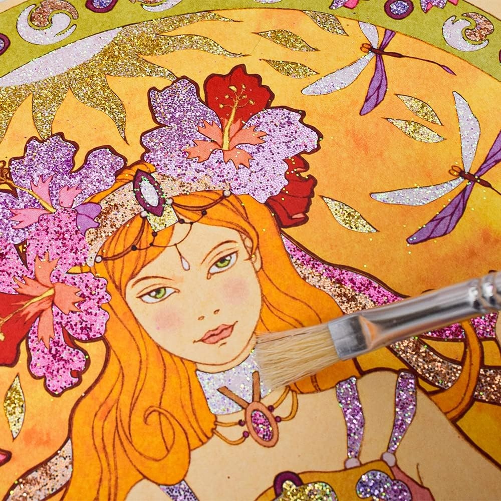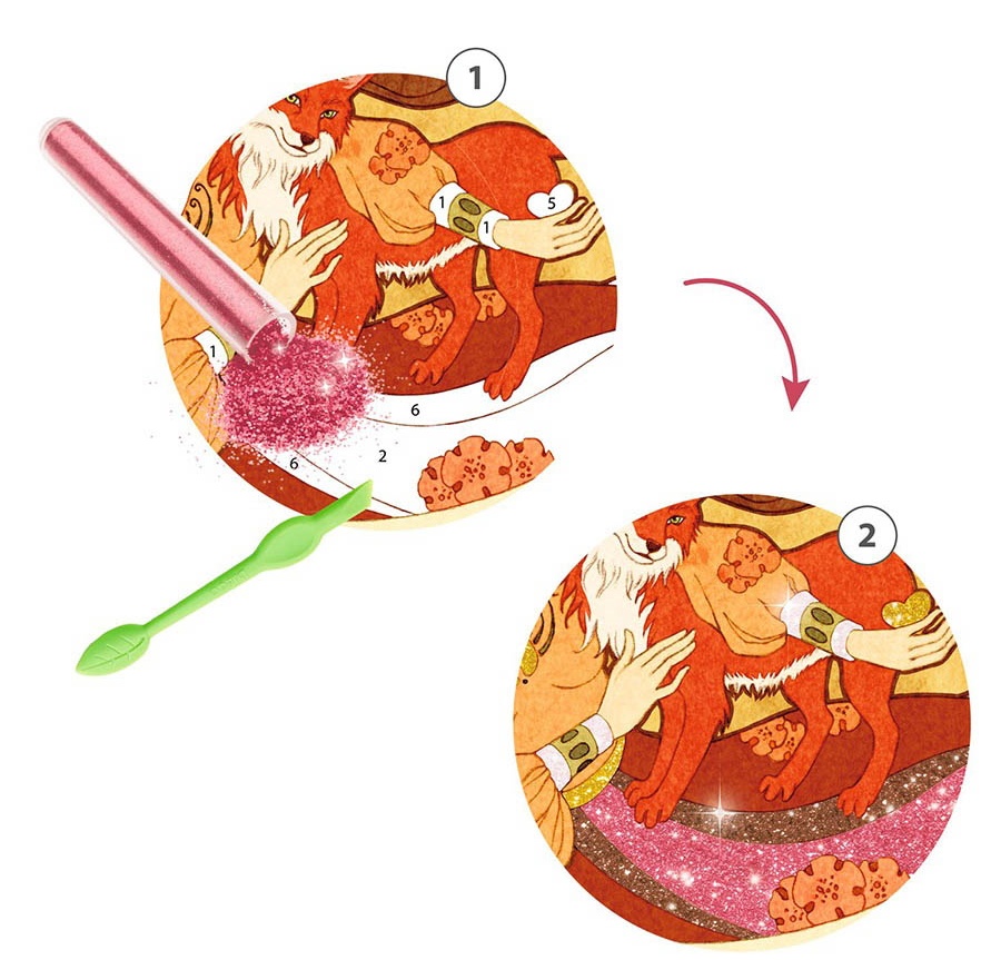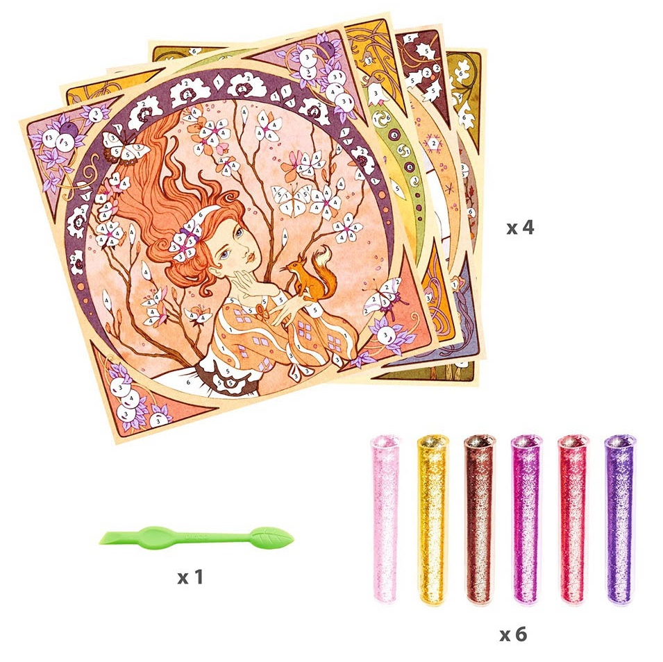 In set4 cartonașe ilustrate, 6 sclipici, 1 perie, 1 tijă de ascuțit (plastic), 1 broșură