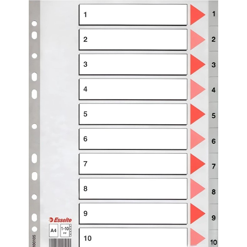 Separatoare Esselte din polipropilenă, format A4, de culoare gri. Câmp mare pe foaia de titlu pentru notarea informațiilor despre conținutul rubricilor. Bandă perforată rezistentă pe foaia de titlu. 10 taburi numerotate de la 1 la 10 pentru o căutare rapidă și comodă a documentelor necesare. Multiperforație universală (11 găuri). Format A4. Material — polipropilenă (PP) cu grosimea de 0,12 mm.