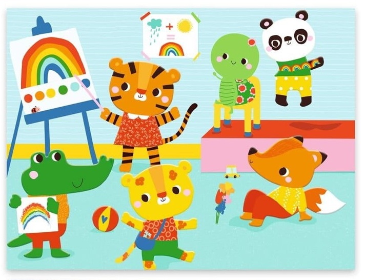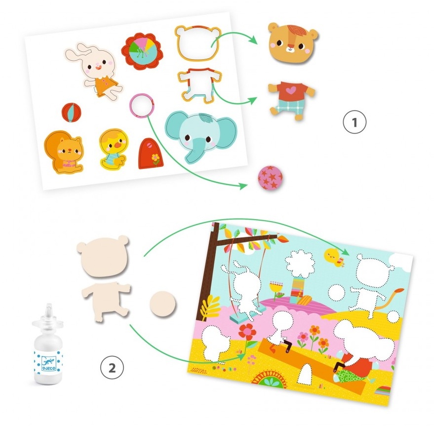 In set4 cartonase cu imagini (21 x 28 cm), 4 foi de carton predecupat, 1 tub de lipici, 1 broșură explicativă color