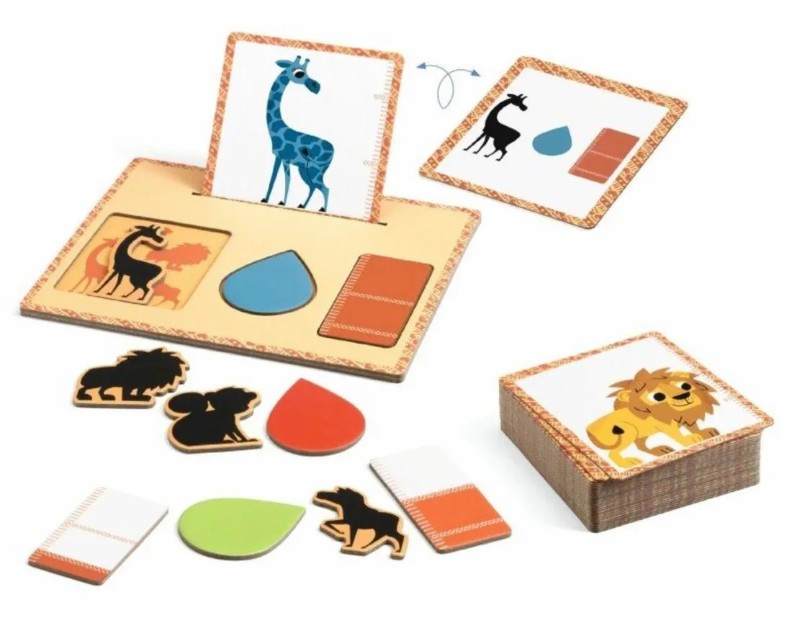 Intra in set48 cartonașe în forme variate, 1 tablă de joc, 11 jetoane în 3 forme diferite, 1 broșură cu instrucțiuni