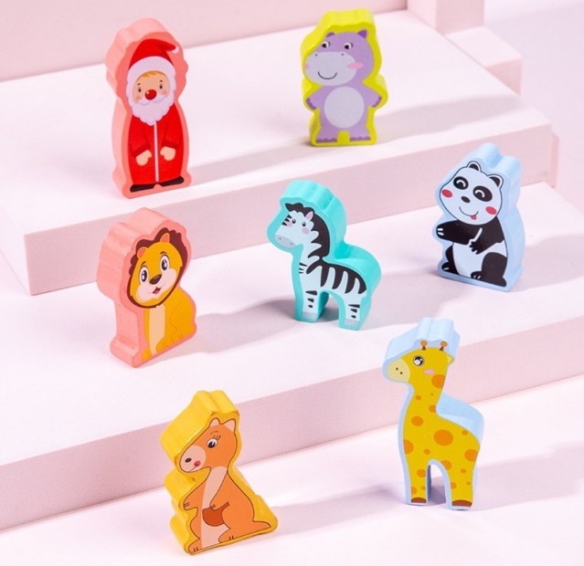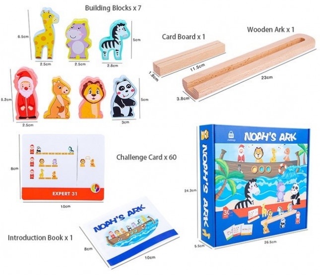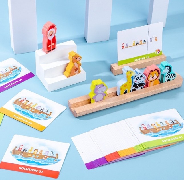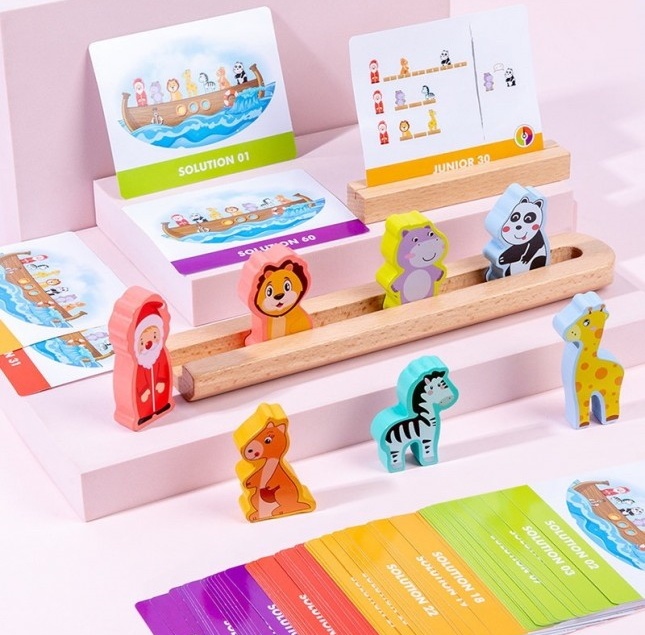 Intra in set7 animale din lemn, carte cu instrucțiuni, suport pentru provocare, barcă pentru animale, 60 provocări