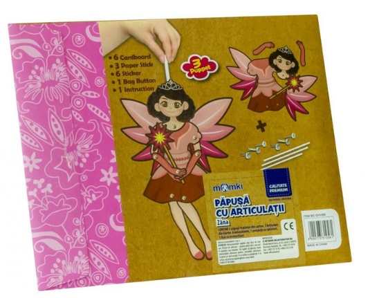 In set3 păpuși cu articulații, 6 foi de carton pentru personalizare, 3 bețe de hârtie pentru accesorii, 6 autocolante decorative, 1 pachet de sclipici pentru un plus de stralucire, 1 foaie cu instrucțiuni detaliate pentru procesul de creație