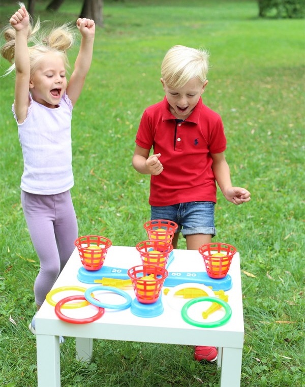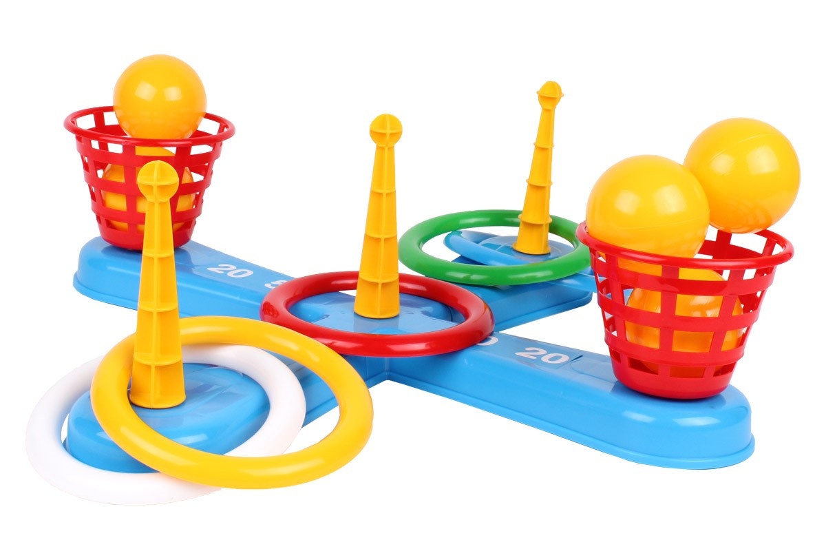 Intra in setbază cruciformă din două piese, tije, inele, 5 coșuri, 5 bile