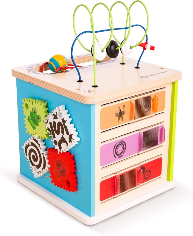 Cinci laturi ale distracției îl așteaptă pe micul tău om de știință. Urmărește cum bebelușul devine fascinat de diferitele lucruri pe care le poate apuca, învârti, învârti și activa. Gadgeturi precum mărgelele plutitoare și angrenajele pătrate curioase îl vor face pe bebelușul să revină la joacă cu această jucărie de dezvoltare. Nu este vorba doar de orice cub de activități, Hape și Baby Einstein au colaborat pentru a adăuga culori strălucitoare și caracteristici magice Stației de Inovație din lemn. Intră într-o lume plină de concepte științifice interesante cu care mai mulți copii se pot juca simultan. Vor fi curioși și dornici să afle ce se întâmplă când împing și trag glisoarele animate sau rotesc angrenajele cu modele îndrăznețe. Cu o cursă cu mingi care sfidează gravitația și multe altele, descoperirea nu se oprește niciodată cu această jucărie pentru copii mici!