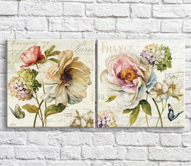 Pictură ArtPoster Butterflies and flowers multicolored on a Beige background, diptych (3467648)