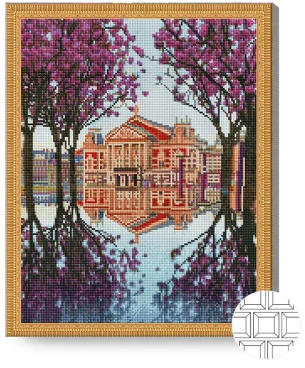 Pictura cu diamante după numere Art Gallery Premium Castel și copaci înfloriți QB206041